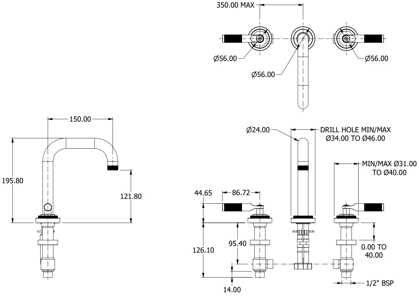 3 Hole basin filler without pop-up waste 198mm