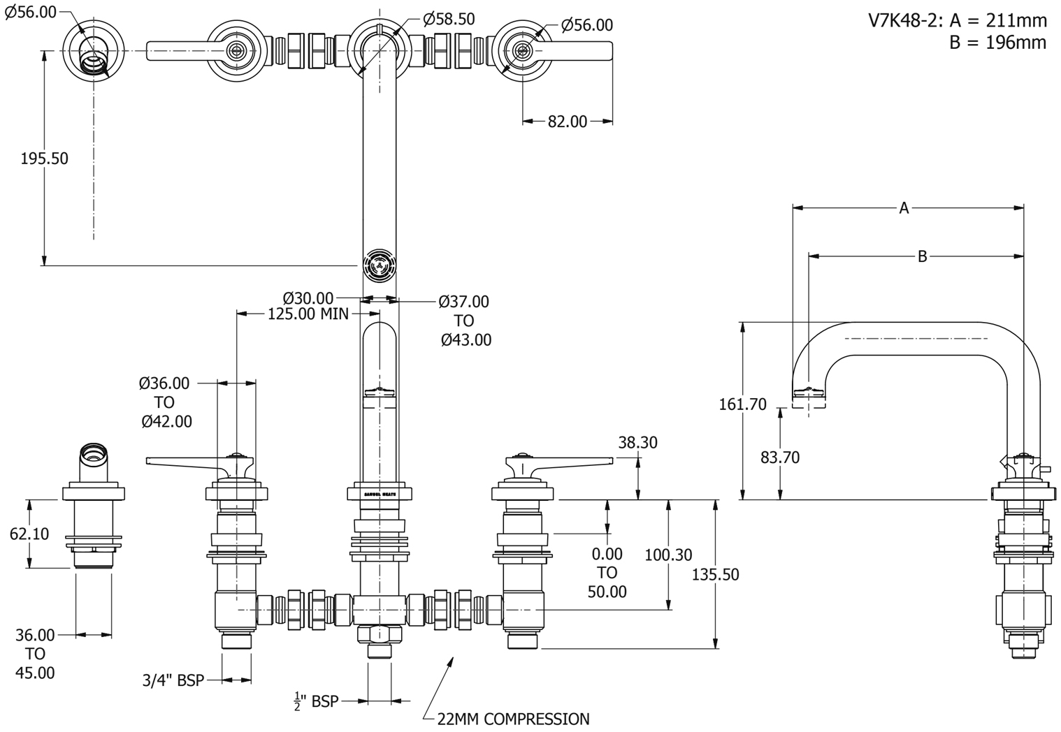 4 Hole bath filler 196mm