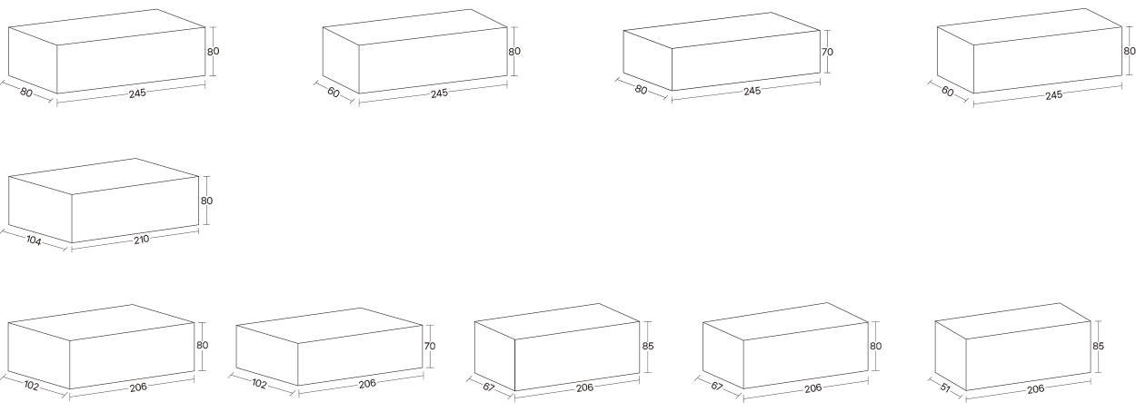 | Size | 245x80x80, 245x80x70, 245x80x60, 245x60x80, 210x104x80, 206x102x80, 206x102x70, 206x67x85, 206x67x80, 206x51x85 |